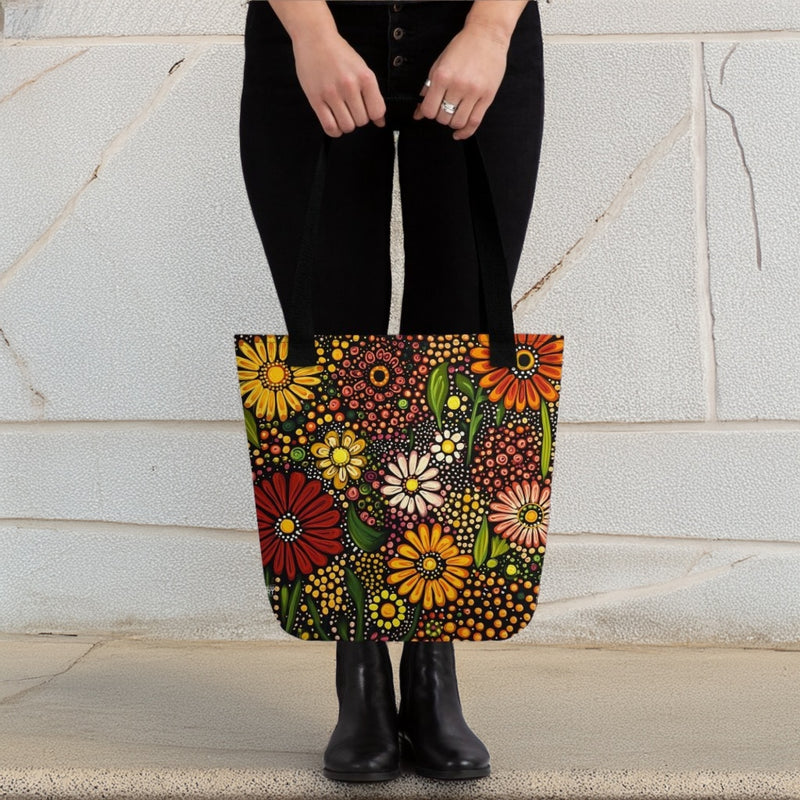Durchdrungen von Wärme und Lebendigkeit ist Flourishing Earth eine faszinierende indigene australische Punktmalerei, die die ungezähmte Schönheit der Wüstenblumen im Outback feiert. Die reichen Töne von rostigem Orange, tiefem Burgunderrot und leuchtendem Limettengrün tanzen vor einem tiefen, kosmischen Hintergrund und symbolisieren die Lebensenergie, die selbst in trockenen Landschaften gedeiht. Zarte Blütenformen entstehen durch kunstvolle Punkttechniken und verweben uralte Geschichten von Erneuerung, Widerstandskraft und der tiefen spirituellen Verbindung zum Land. Dieses Kunstwerk verkörpert die pulsierende Lebendigkeit von Wildblumen, die leisen Stimmen der Traumzeit und den ewigen Kreislauf der Natur.
