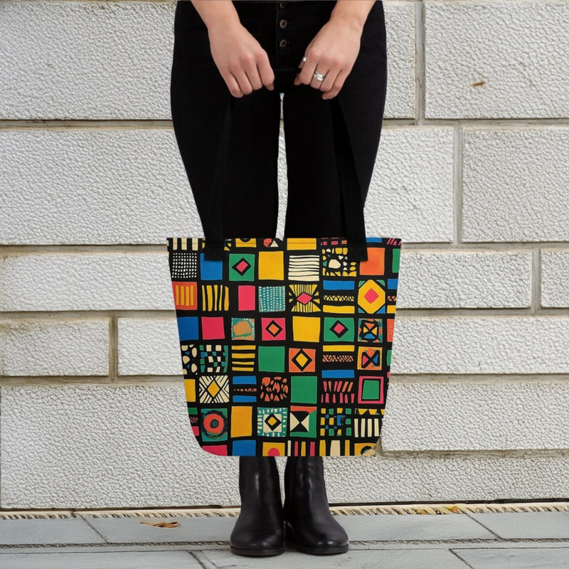 Eine lebendige Fusion aus Ndebele- und Kente-Textiltraditionen, Tribal Tapestry fängt den Geist afrikanischer kultureller Ausdrucksformen durch markante geometrische Muster und rhythmische Symmetrie ein. Die gitterartige Anordnung von leuchtendem Gelb, tiefem Grün, sattem Rot und Kobaltblau wird durch kräftige schwarze Umrisse betont, die an die kunstvollen handgewebten Kente-Stoffe und die symbolträchtigen Wandmalereien der Ndebele erinnern. Jede Form und Linie erzählt eine Geschichte von Erbe, Identität und kreativer Widerstandskraft. Diese dynamische Komposition bringt eine kraftvolle Energie und kulturellen Stolz in jeden Raum.