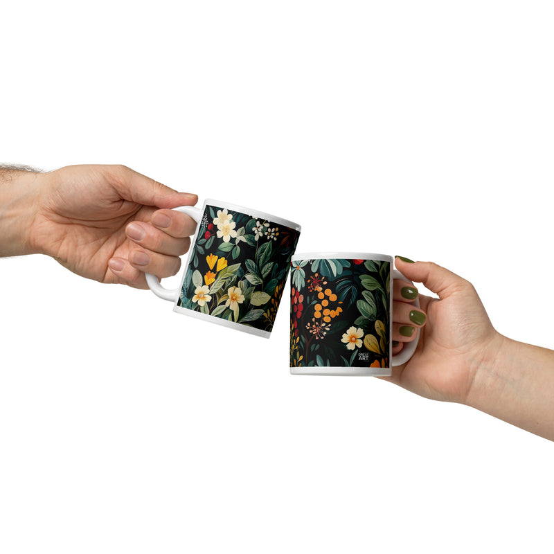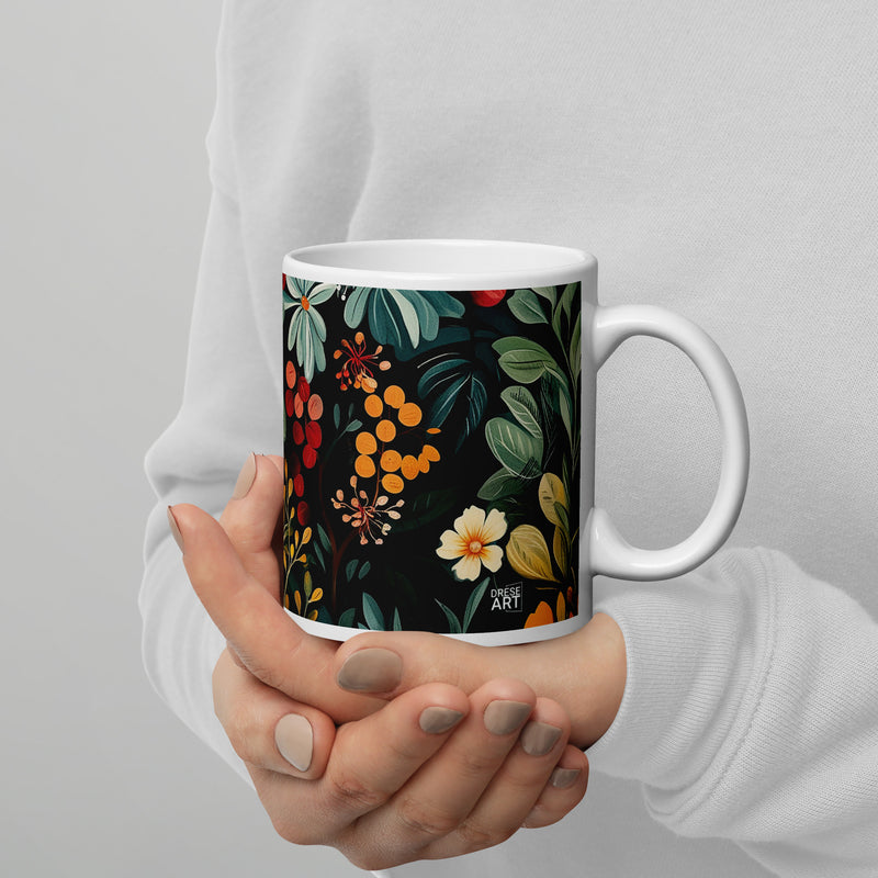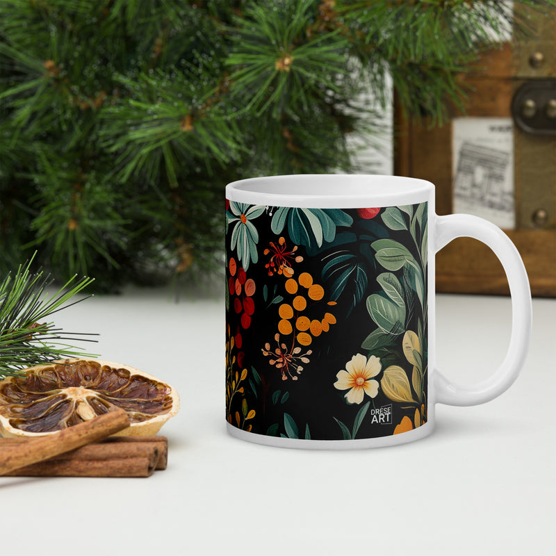 “Midnight Bloom“ zeigt die Eleganz der Natur mit leuchtenden Blumen vor einem tiefdunklen Hintergrund. Dieses florale Kunstwerk strahlt Ruhe und Geheimnis aus und verbindet warme Herbsttöne mit kühlen Grüntönen.