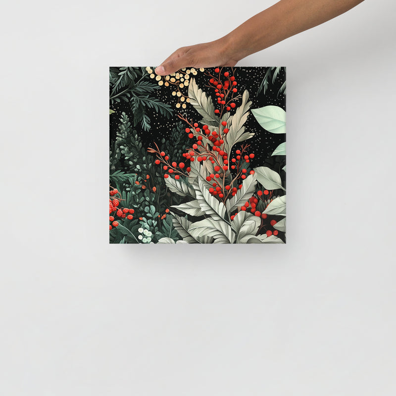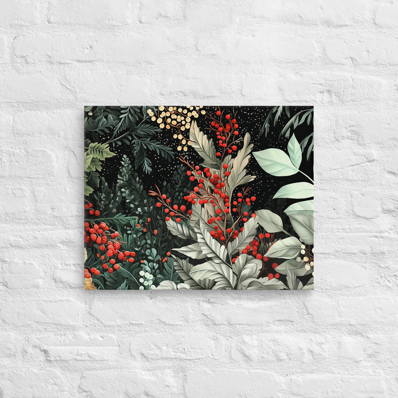 Enhance your decor with our ultra-sleek thin canvas print, now offering FREE SHIPPING to the US, Canada, EU, and UK!   The artwork   Winter Garden captures the magic of winter with rich, deep greens and vibrant red berries against...