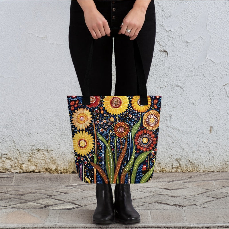 Rooted in the rich tradition of Indigenous Australian dot painting, Sunlit Dreaming captures the radiant beauty of desert wildflowers in full bloom. Set against a deep, star-speckled night sky, the golden sunburst flowers, earthy reds, and vibrant greens come alive through a tapestry of intricate dots and flowing forms. Each petal and leaf carry the energy of the land, symbolizing resilience, renewal, and the sacred connection between nature and culture. The rhythmic patterns echo Dreamtime stories, celebrating the life-giving forces of the sun, rain, and earth. This piece is a timeless tribute to the beauty of the Australian Outback.