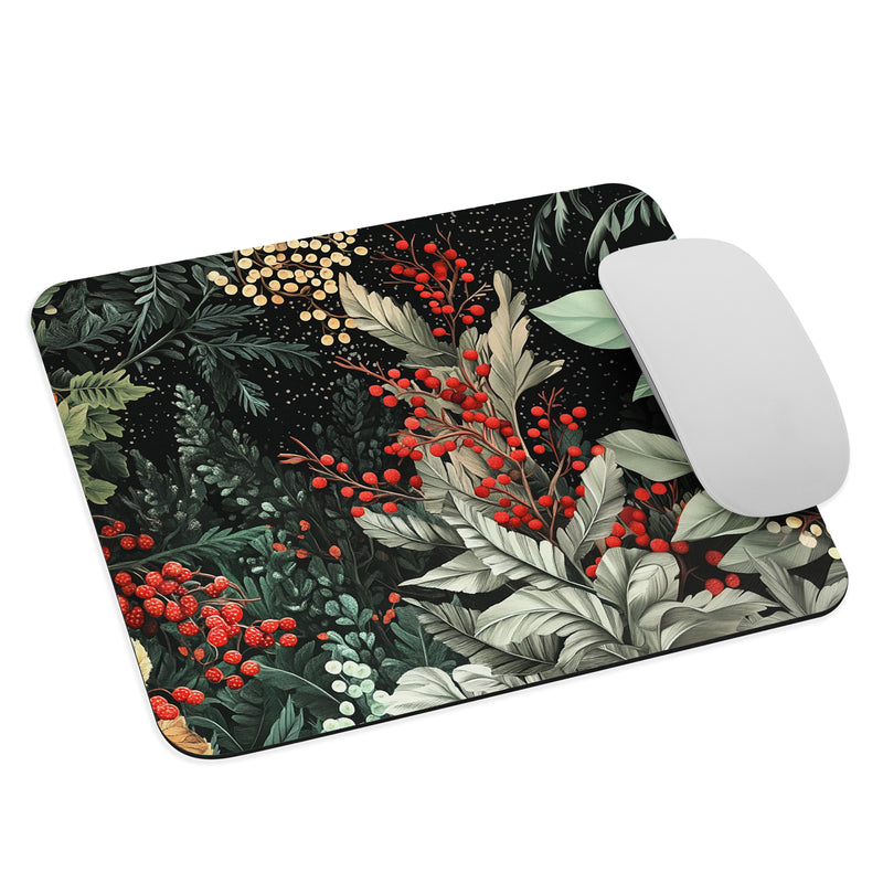 Enhance your computing experience with our high-quality mouse pad, offering FREE SHIPPING to the US, Canada, EU, and UK.   The artwork   Winter Garden captures the magic of winter with rich, deep greens and vibrant red berries against a...