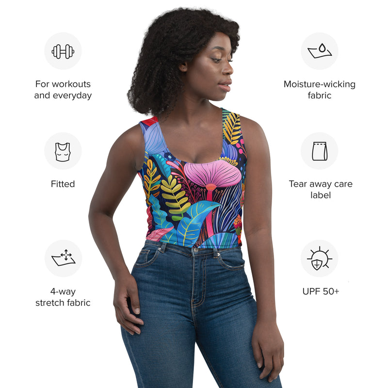 Look fabulous in this all-over printed, body-hugging crop top, now offering FREE SHIPPING to the US, Canada, EU, and UK!