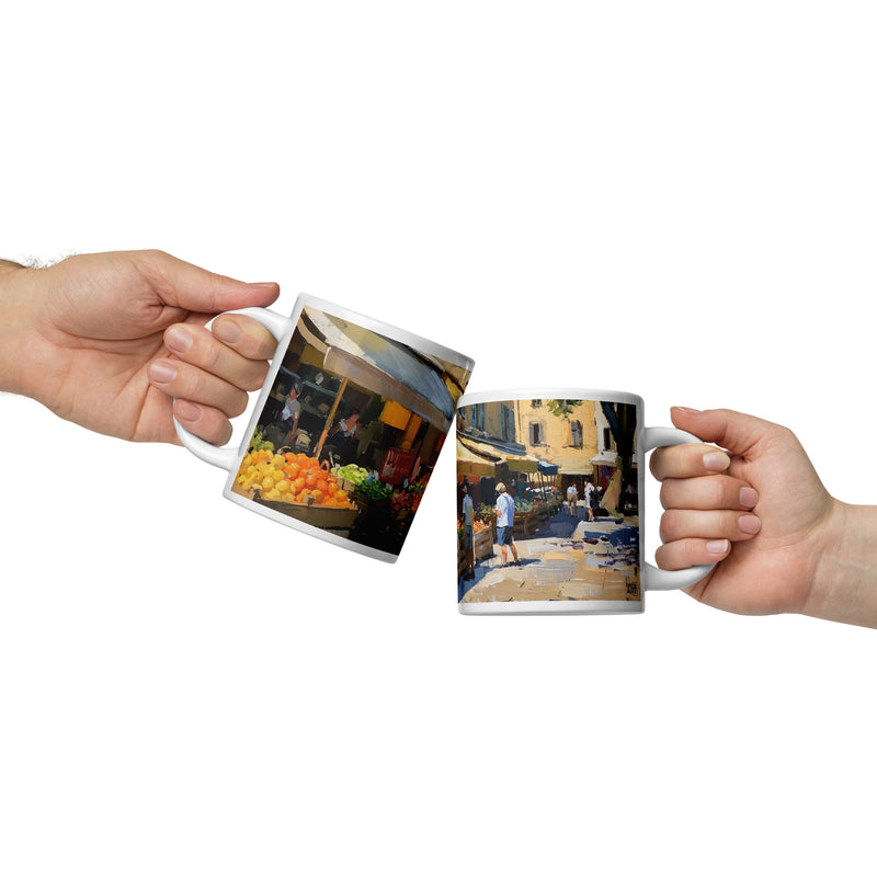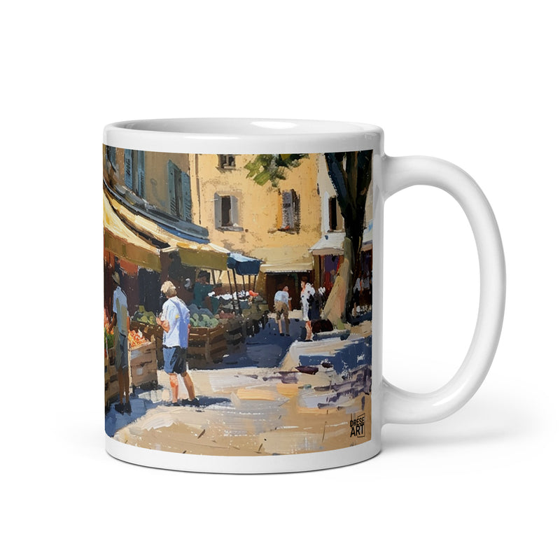 Stroll through the sun-drenched streets of Provence, where golden buildings bask in the sunlight, casting a warm glow on the vibrant marketplace below. Fresh, colorful produce is artfully displayed, inviting passersby to savor the rich flavors and aromas of this picturesque French region.