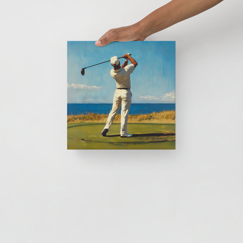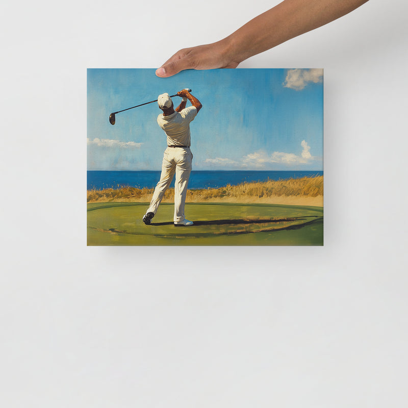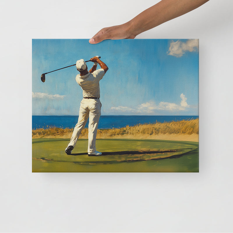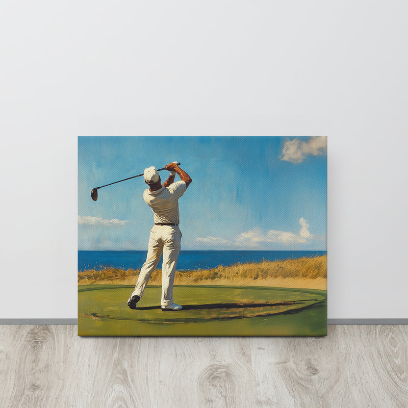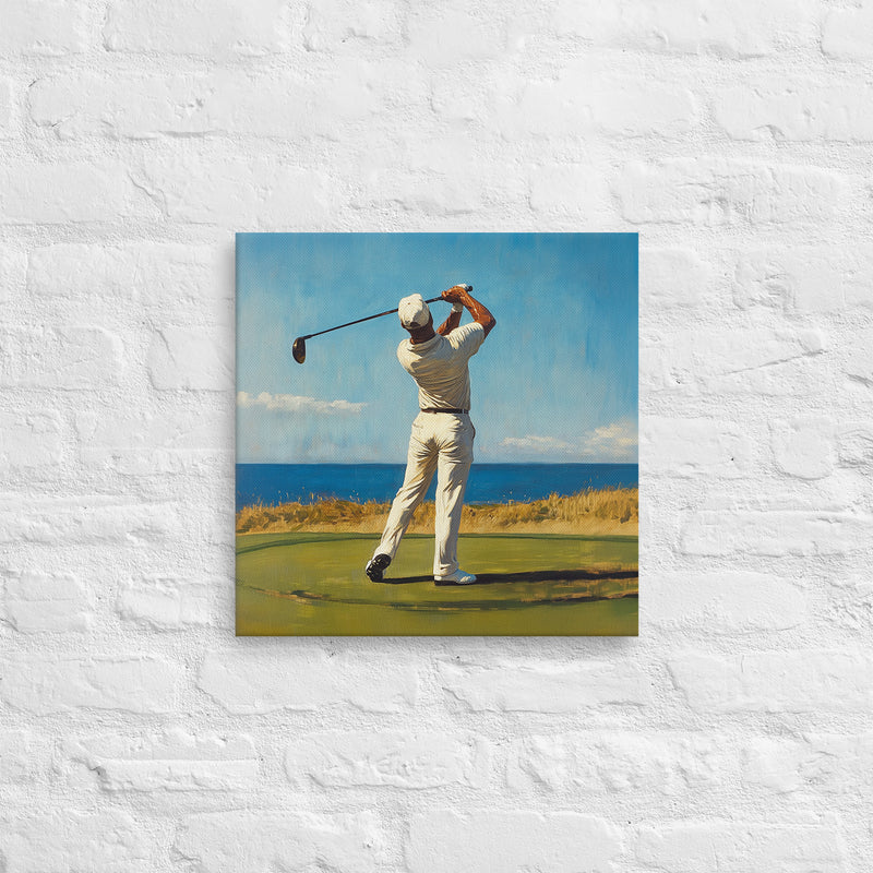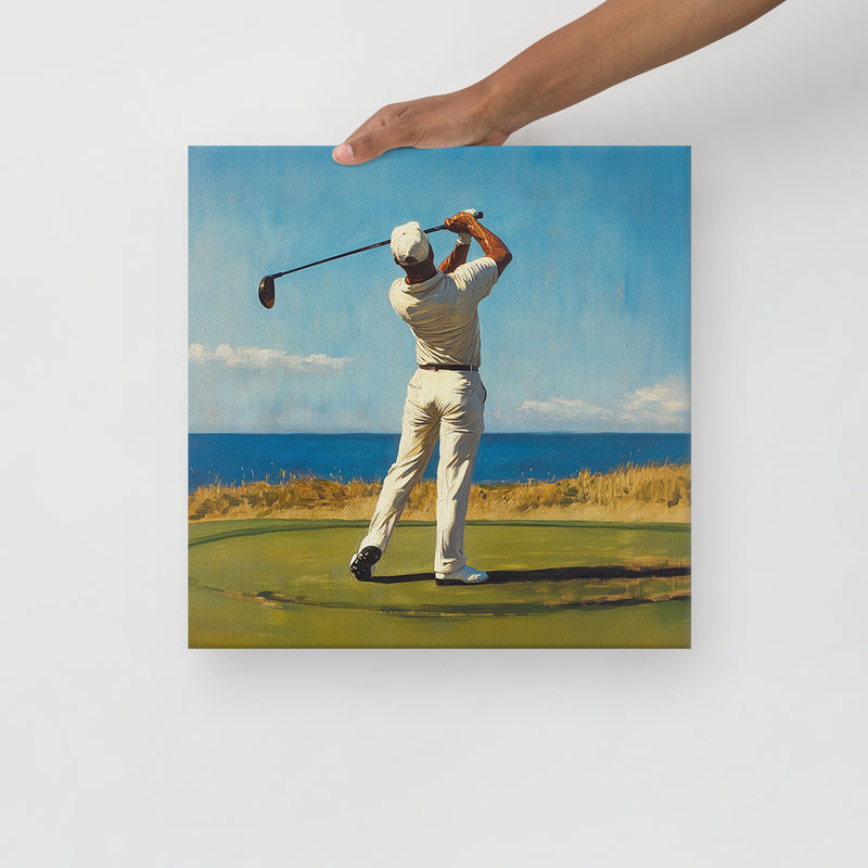 Coastal Drive captura la elegancia de un perfecto swing de golf en un apacible paisaje oceánico. Esta pieza de golf refleja enfoque y tranquilidad, lo que la convierte en una obra ideal tanto para entusiastas del golf como para amantes del arte.