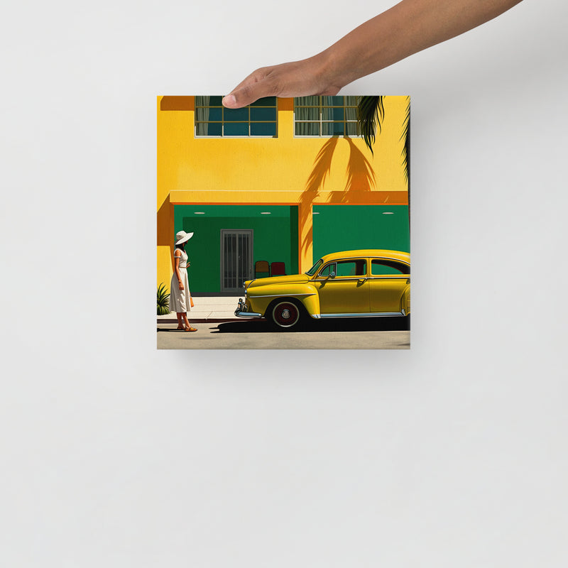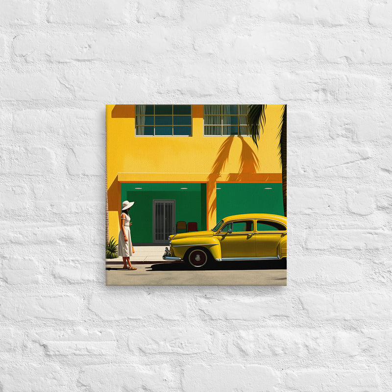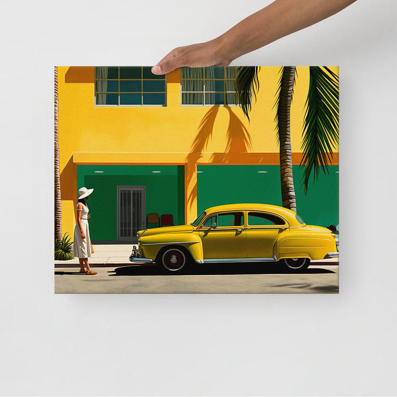 Adéntrate en un mundo donde el arte se encuentra con lo cotidiano, capturando la esencia de un día soleado en esta vibrante obra. Un coche clásico amarillo, palmeras y una arquitectura audaz pintan una escena de elegancia atemporal y el encanto de los años 50. Es un viaje visual a una era de simplicidad y estilo.