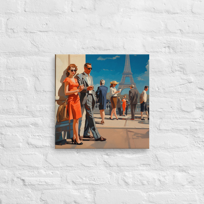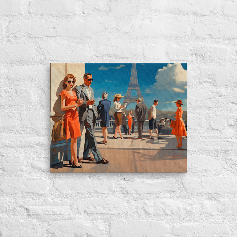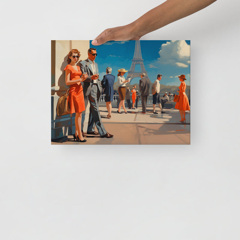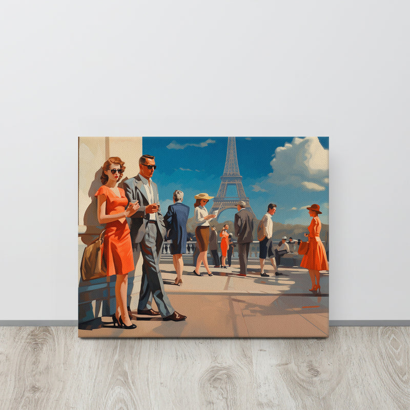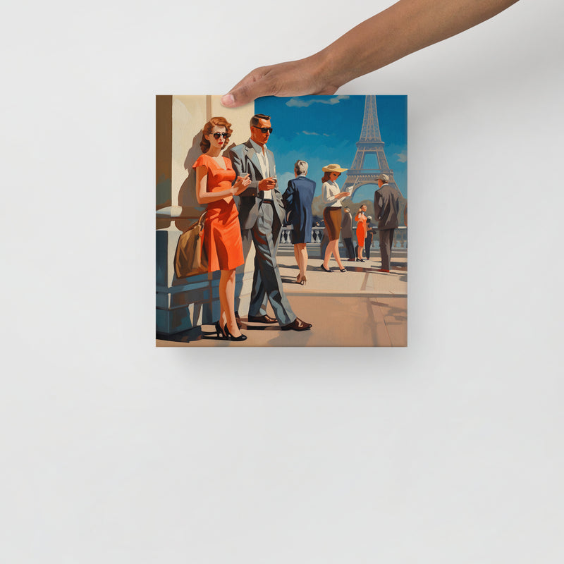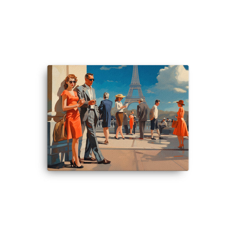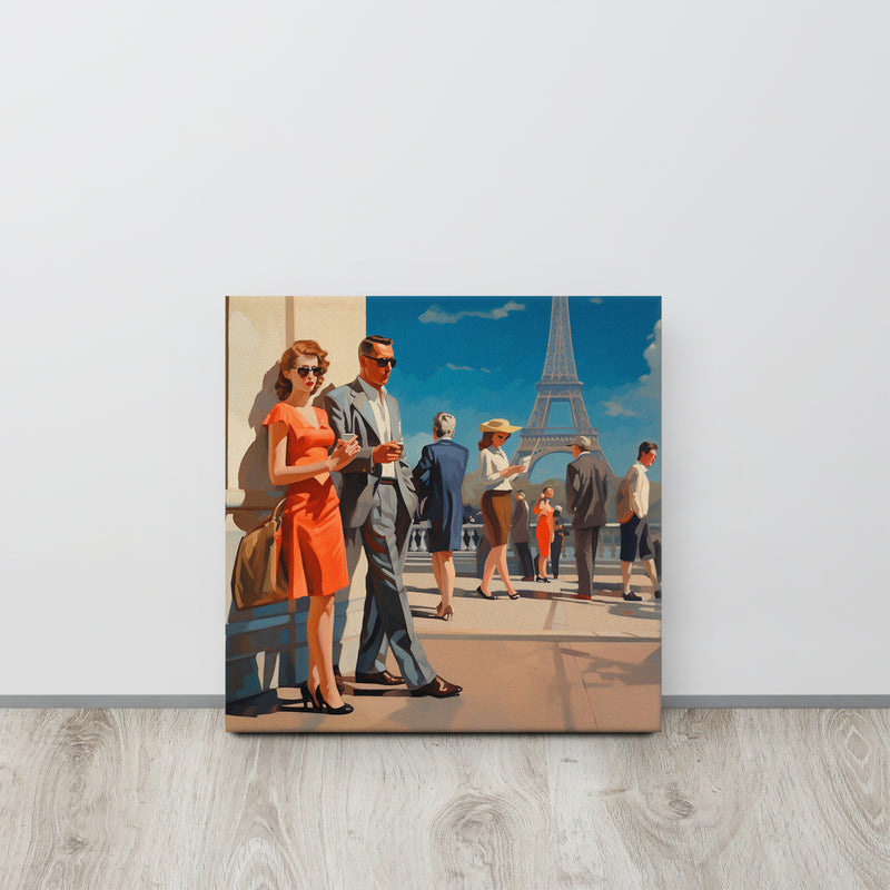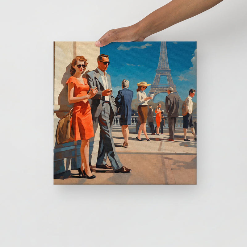 Sumérgete en la elegancia de una época pasada, inmortalizada en esta obra que retrata elegantes personajes admirando la icónica Torre Eiffel. Los colores vibrantes y la moda atemporal evocan el eterno atractivo de París, convirtiendo esta pieza en una adición perfecta para los amantes del arte y de la Ciudad de la Luz.