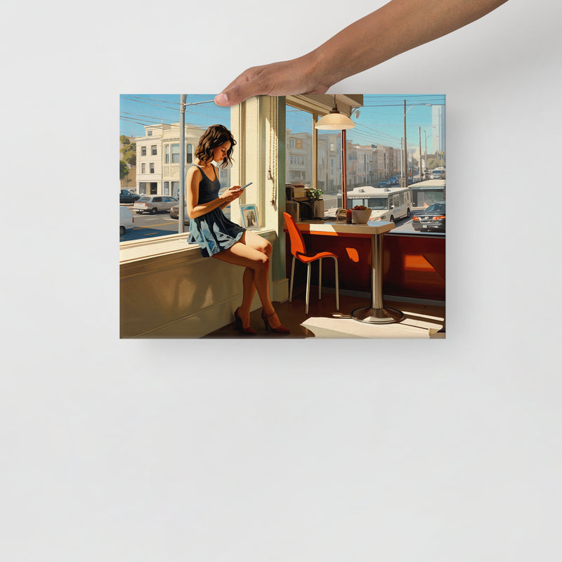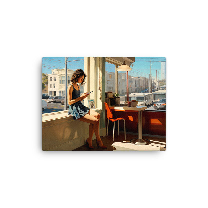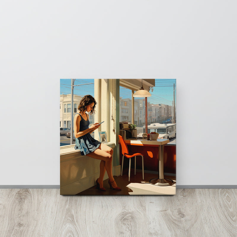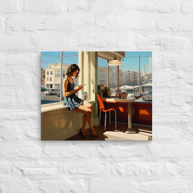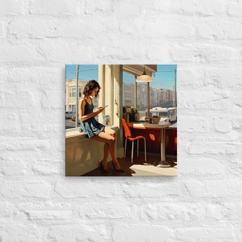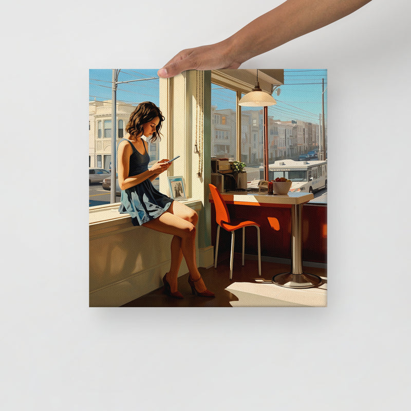 Esta obra captura un momento de paz en el interior de un acogedor café iluminado por el sol, en contraste con el bullicioso paisaje urbano exterior. El marcado contraste entre el tranquilo interior tranquilo y el dinámico exterior está bellamente representado, ofreciendo una mezcla de serenidad y sofisticación urbana.