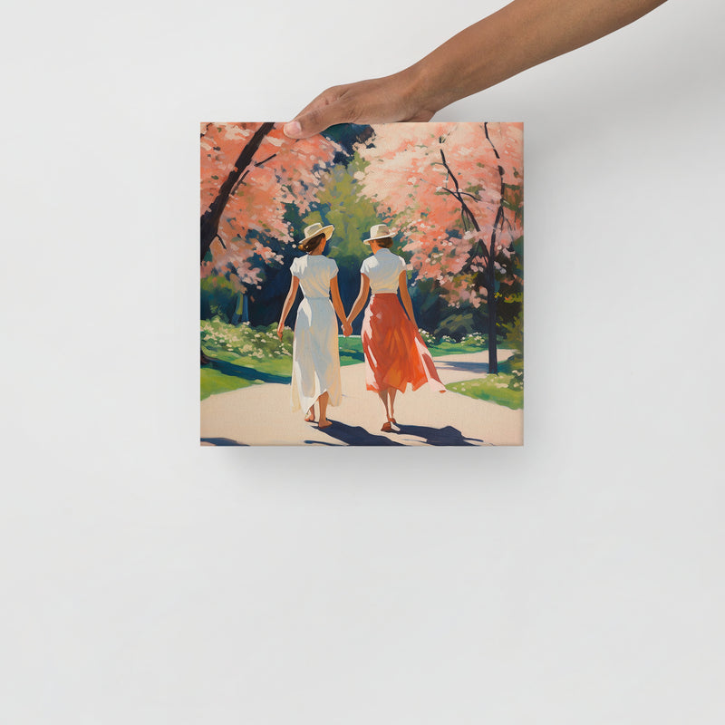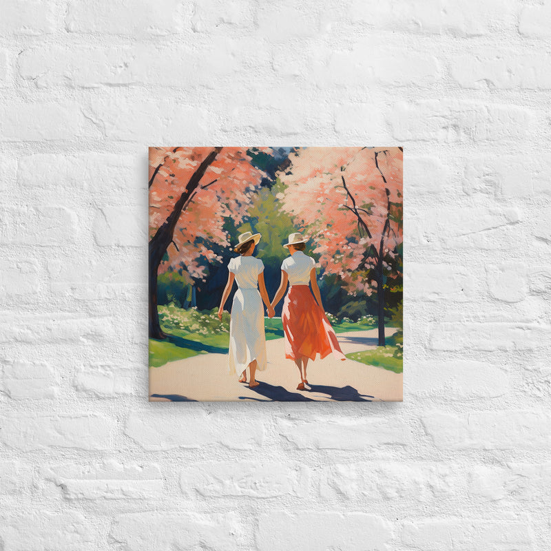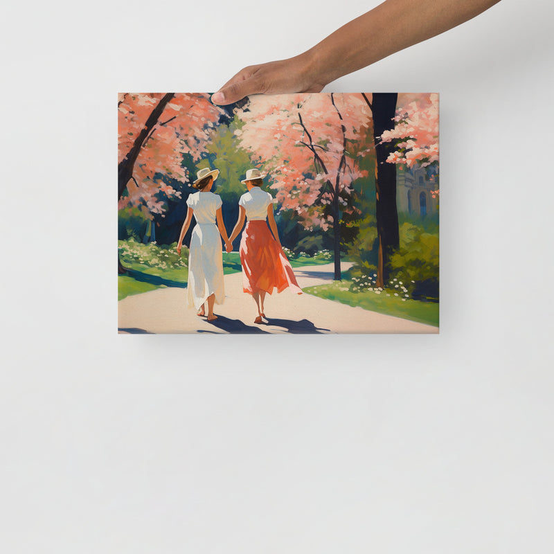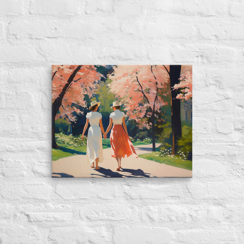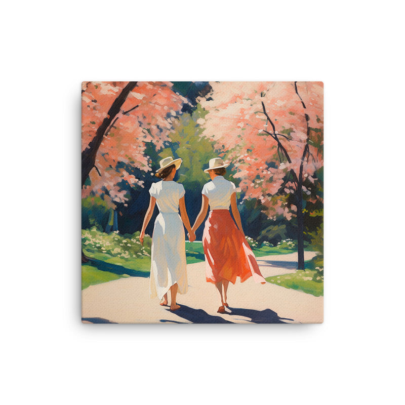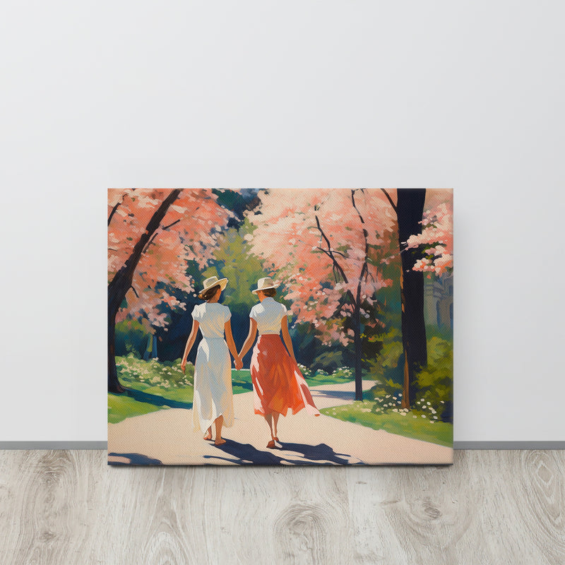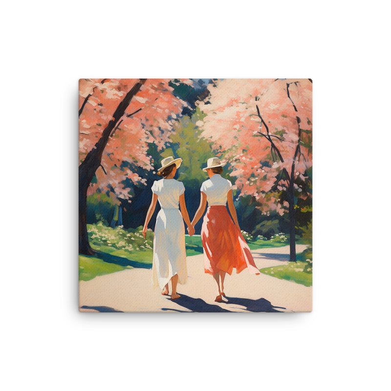 Un sereno paseo de dos mujeres entre las flores, esta obra captura la esencia de la primavera. Cada pincelada refleja la belleza y armonía del despertar de la naturaleza, ofreciendo una sensación de calma e inspiración.