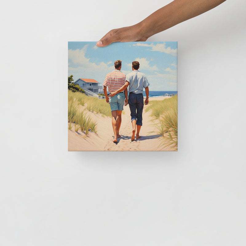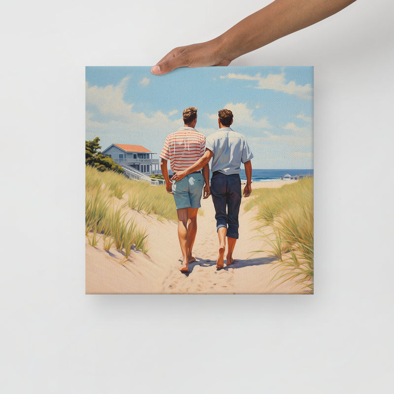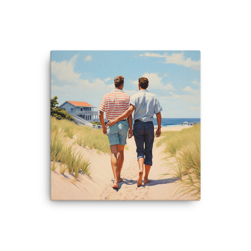 Esta obra retrata una tranquila escena costera, donde dos hombres caminan por un sendero de arena entre verdes dunas hacia el océano. La casa de la playa y el cielo despejado completan la serena atmósfera. Cada pincelada cuenta una historia de paz, armonía y momentos compartidos entre doradas arenas y cielos azules.