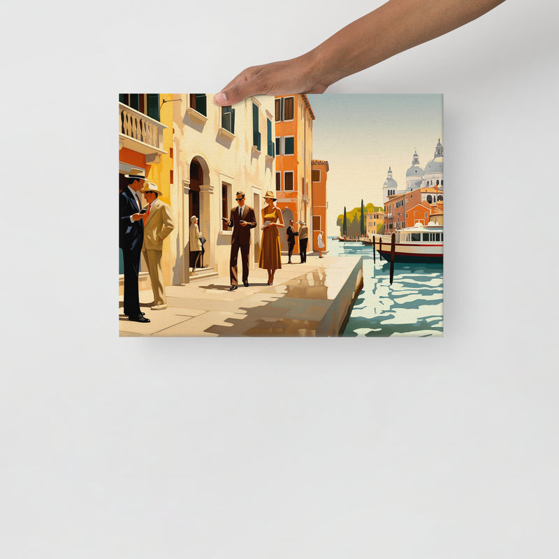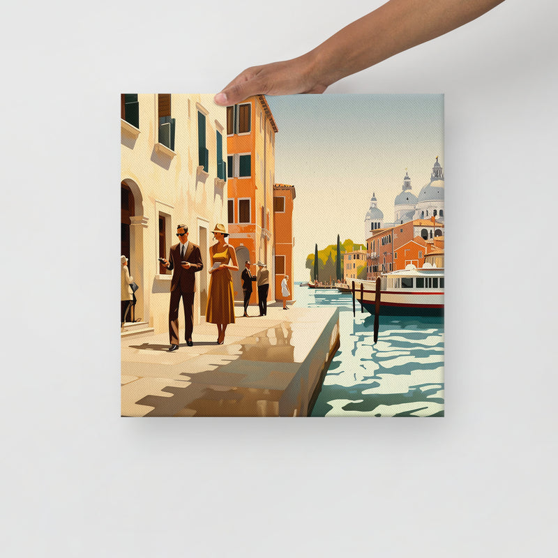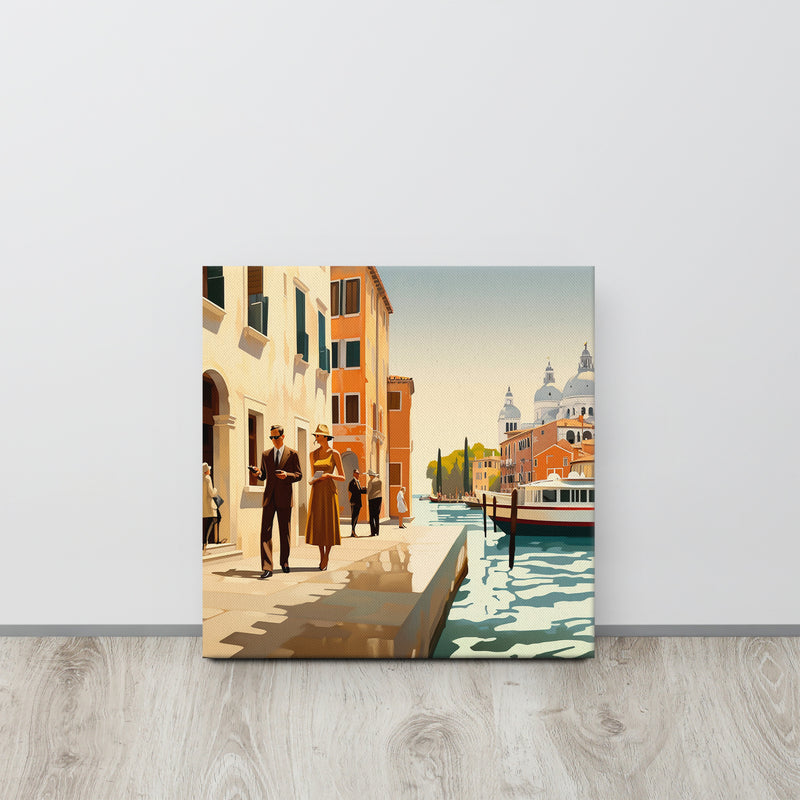 Esta obra retrata una serena escena de Venecia, la ciudad de los canales y el amor. La pieza muestra la tradicional arquitectura veneciana en tonos cálidos, contrastados por el azul del cielo despejado y las tranquilas aguas. Las elegantes figuras, vestidas con atuendos vintage, evocan una sensación de nostalgia y encanto.