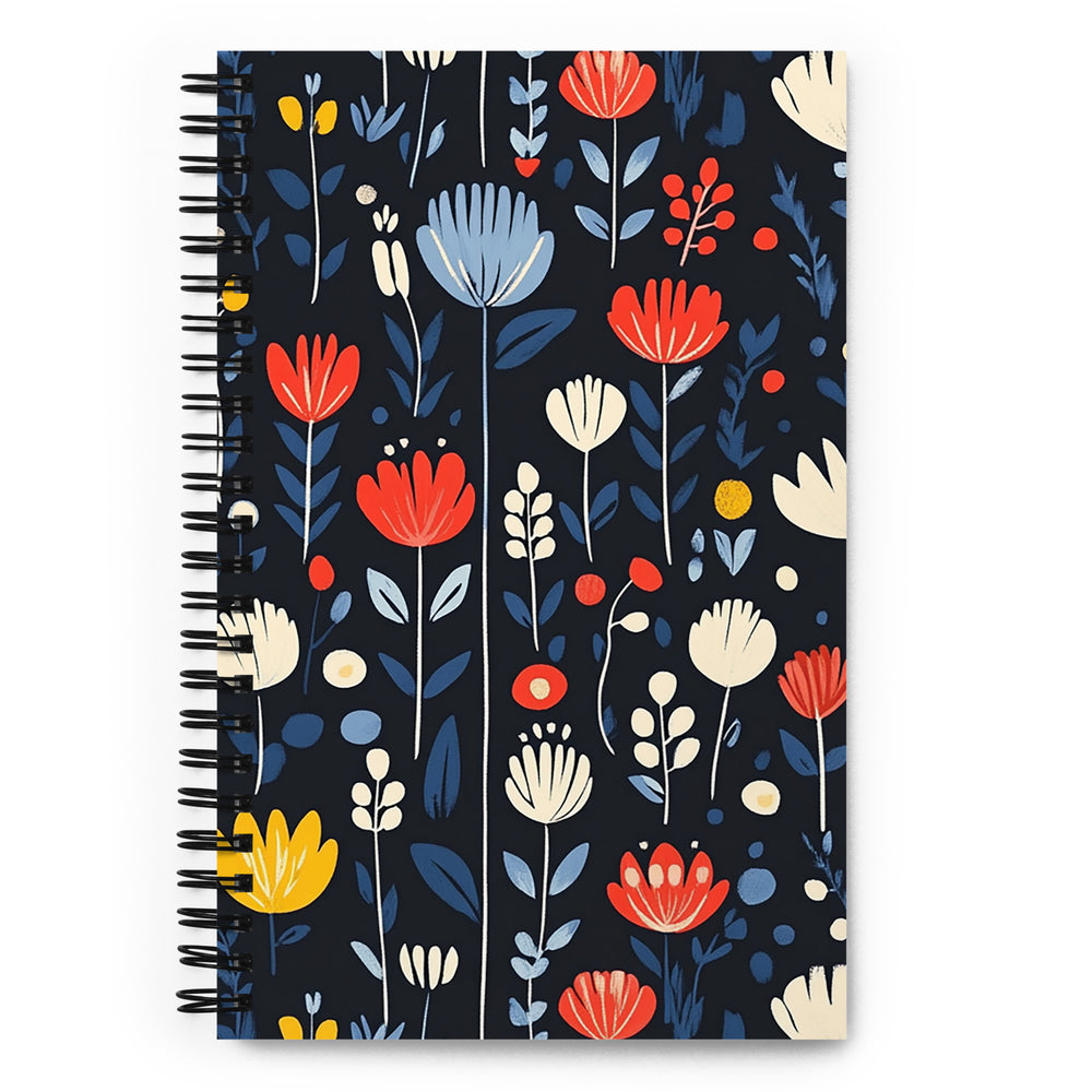 Embodying the timeless charm of Scandinavian folk art, Nordic Meadow is a beautifully stylized floral composition that blends minimalist elegance with folkloric warmth. Delicate blossoms in soft ivory, muted blue, vibrant red, and golden yellow bloom gracefully against a deep midnight background, creating a striking contrast reminiscent of traditional Nordic patterns. The hand-drawn simplicity and organic symmetry reflect the heritage of Nordic storytelling, where nature and craftsmanship intertwine in a celebration of life’s quiet beauty.