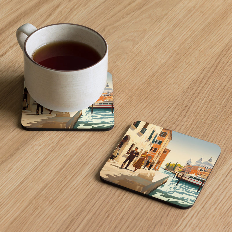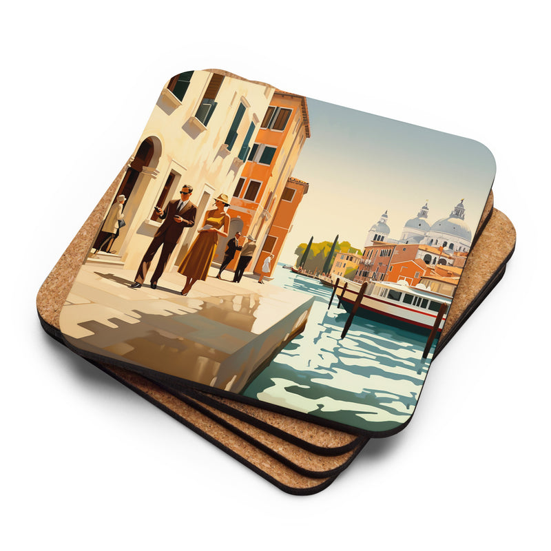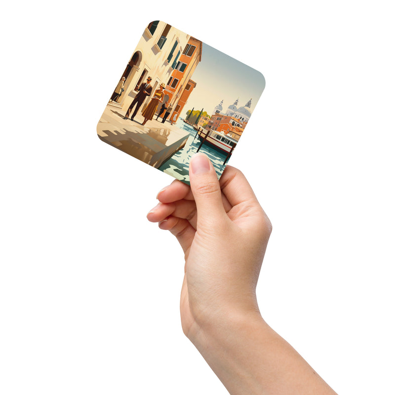 Cette œuvre dépeint une scène sereine de Venise, la ville des canaux et de l’amour. La pièce montre l’architecture vénitienne traditionnelle dans des tons chauds, contrastés par le bleu du ciel dégagé et les eaux tranquilles. Les figures élégantes, vêtus de tenues vintage, évoquent une sensation de nostalgie et de charme.