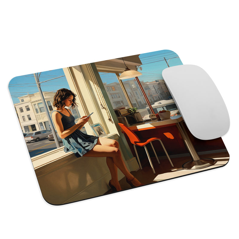 Cette œuvre capture un moment de paix dans l’intérieur d’un café ensoleillé, contrastant avec le paysage urbain animé à l’extérieur. Le contraste marqué entre le calme intérieur et la dynamique extérieure est magnifiquement représenté, offrant un mélange de sérénité et de sophistication urbaine.