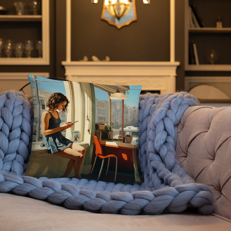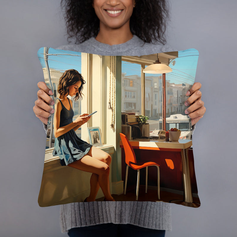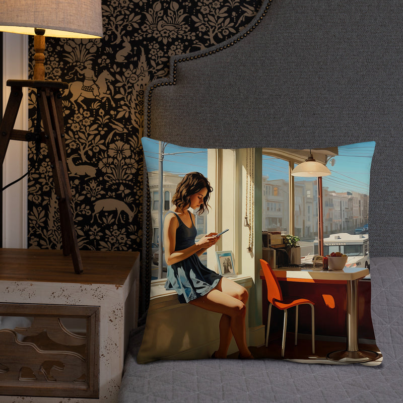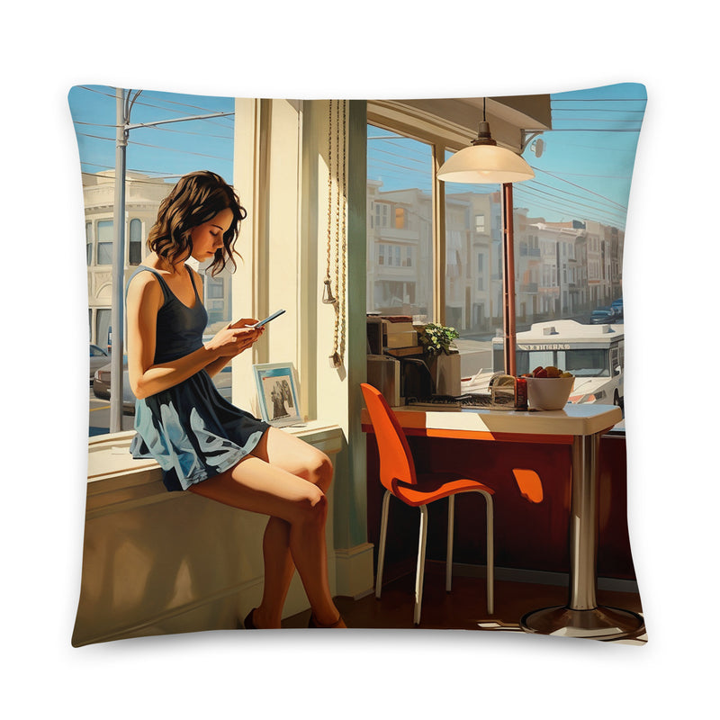 Cette œuvre capture un moment de paix dans l’intérieur d’un café ensoleillé, contrastant avec le paysage urbain animé à l’extérieur. Le contraste marqué entre le calme intérieur et la dynamique extérieure est magnifiquement représenté, offrant un mélange de sérénité et de sophistication urbaine.