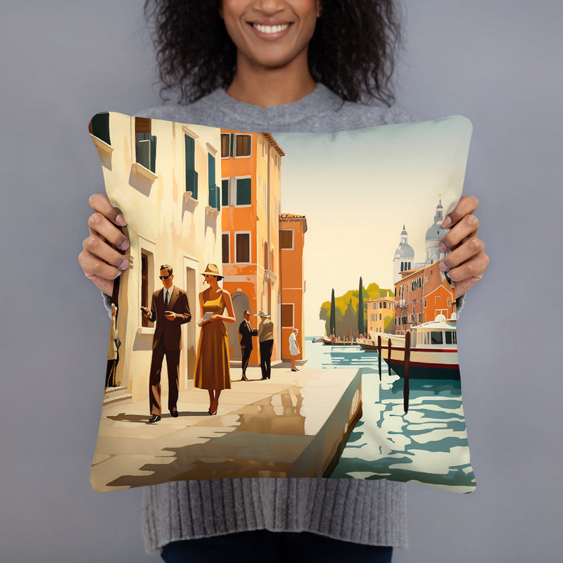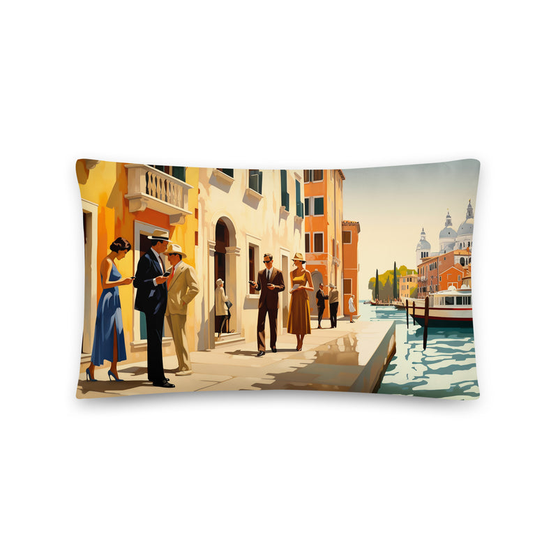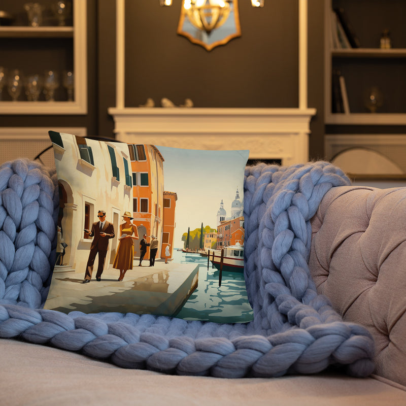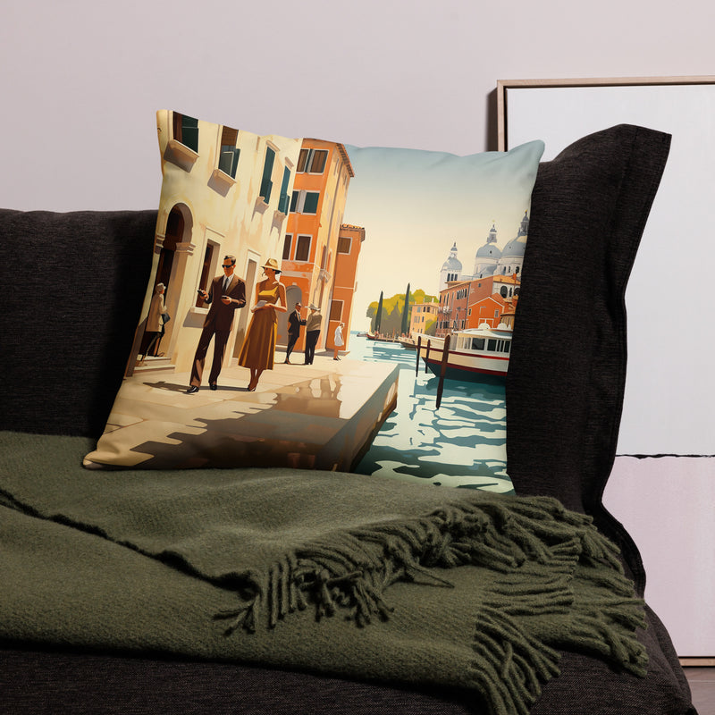 Cette œuvre dépeint une scène sereine de Venise, la ville des canaux et de l’amour. La pièce montre l’architecture vénitienne traditionnelle dans des tons chauds, contrastés par le bleu du ciel dégagé et les eaux tranquilles. Les figures élégantes, vêtus de tenues vintage, évoquent une sensation de nostalgie et de charme.