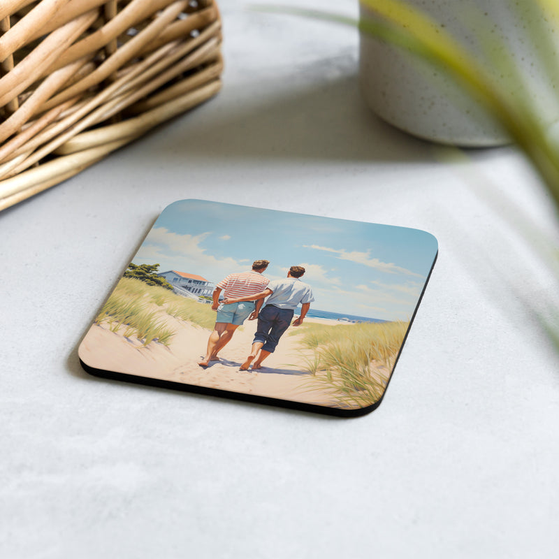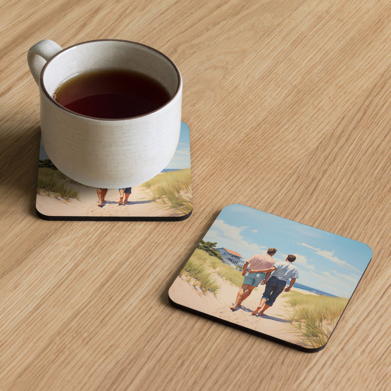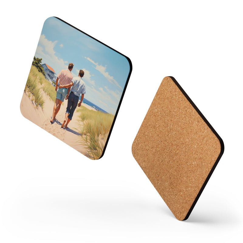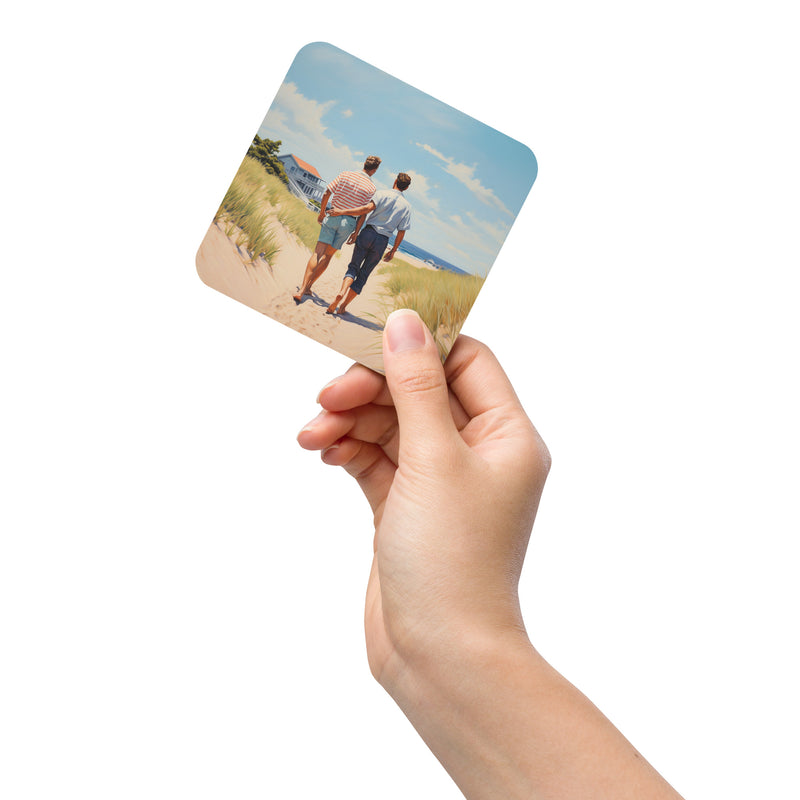 This artwork depicts a tranquil coastal scene, where two men walk along a sandy path amidst green dunes, towards the ocean. The beach house and the clear blue sky add to the serene atmosphere. Every brushstroke tells a story of peace, harmony, and timeless moments shared amidst golden sands and azure skies.