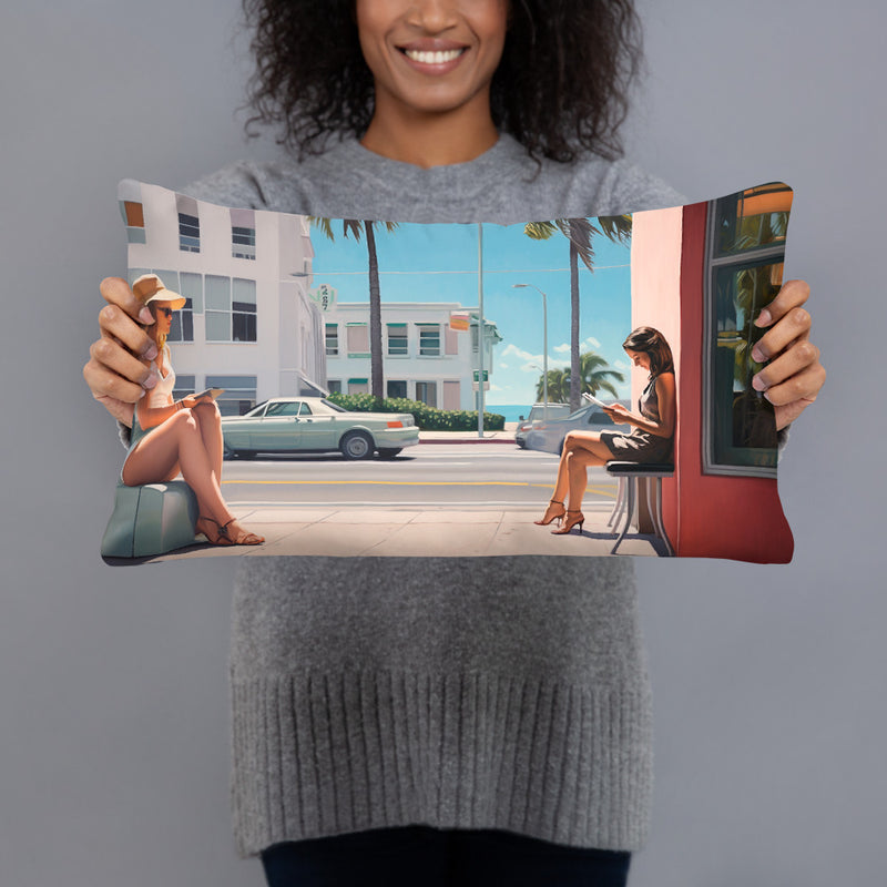 Bask in the serene ambiance of this artwork capturing a tranquil Miami street. Palm trees sway, casting gentle shadows on the sidewalk where two individuals are engrossed in reading, embodying a moment of peace amidst urban life. A perfect blend of nature and cityscape.