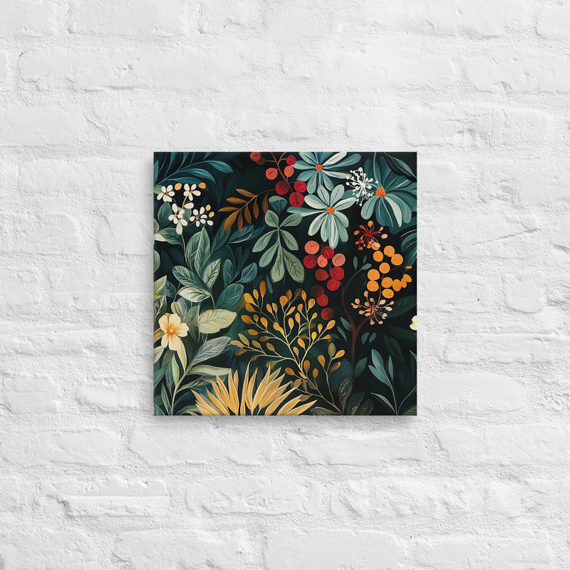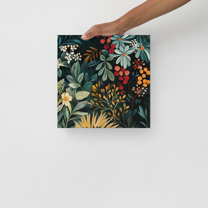 Midnight Bloom captures nature's elegance with vibrant florals against a deep, dark backdrop. This floral artwork evokes serenity and mystery, blending warm autumn hues and cool greens.