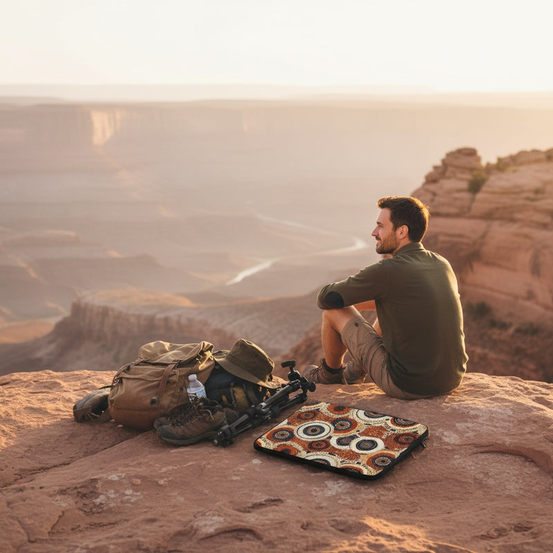 Inspired by the ancient traditions of Indigenous Australian dot painting, Sacred Earth embodies the spiritual connection between land, culture, and storytelling. Radiating circles and intricate dot formations symbolize the cycles of life, the gathering of communities, and the sacred landscapes of the Dreamtime. The warm, organic palette of terracotta, clay, and taupe evokes the richness of sunbaked earth, while deep charcoal and cream accents add depth and contrast. This design is a visual journey through tradition, memory, and the enduring spirit of the land.