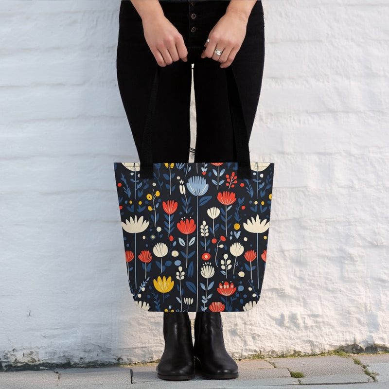 Embodying the timeless charm of Scandinavian folk art, Nordic Meadow is a beautifully stylized floral composition that blends minimalist elegance with folkloric warmth. Delicate blossoms in soft ivory, muted blue, vibrant red, and golden yellow bloom gracefully against a deep midnight background, creating a striking contrast reminiscent of traditional Nordic patterns. The hand-drawn simplicity and organic symmetry reflect the heritage of Nordic storytelling, where nature and craftsmanship intertwine in a celebration of life’s quiet beauty.